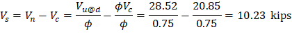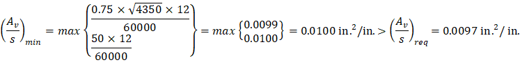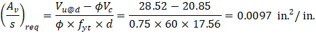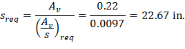 Try # 3, Grade 60 two-leg stirrups (Av = 2 × 0.11 = 0.22 in.2).