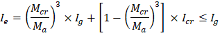 The effective moment of inertia (Ie) is used to account for the cracking effect on the flexural stiffness of the slab. Ie for uncracked section (Mcr > Ma) is equal to Ig. When the section is cracked (Mcr < Ma), then the following equation should be used:
