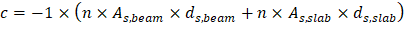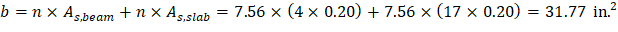 As calculated previously, the positive reinforcement for the end span frame strip is 22 #4 bars located at 1.0 in. along the slab section from the bottom of the slab and 4 #4 bars located at 1.75 in. along the beam section from the bottom of the beam. Five of the slab section bars are not continuous and will be excluded from the calculation of Icr. The Figure below shows all the parameters needed to calculate the moment of inertia of the cracked section transformed to concrete at midspan.
