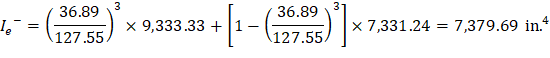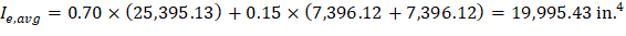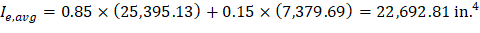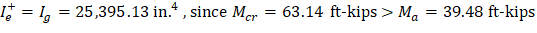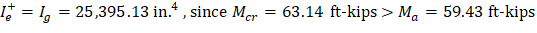 PCA Notes on ACI 318-11 (9.5.2.4(1)) Where: Ie- = The effective moment of inertia for the critical negative moment section near the support. Ie+ = The effective moment of inertia for the critical positive moment section (midspan). For the interior span (span with both ends continuous) with service load level (D+LLfull): Since Mcr = 36.89 ft-kips < Ma = 115.72 ft-kips ACI 318-14 (24.2.3.5a) The averaged effective moment of inertia (Ie,avg) is given by: PCA Notes on ACI 318-11 (9.5.2.4(2)) Where: Ie,l- = The effective moment of inertia for the critical negative moment section near the left support. Ie,r- = The effective moment of inertia for the critical negative moment section near the right support.