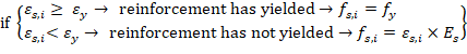 The force developed in the reinforcement layer (Fs,i) is considered as compression force (Cs,i) if the effective depth of this steel layer (di) is less than c (the distance from the fiber of maximum compressive strain to the neutral axis), otherwise it is considered as tension force (Ts,i).