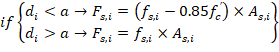 If the reinforcement layer is located within the depth of the equivalent rectangular stress block (a), it is necessary to subtract 0.85fc’ from fs,i before computing Fs,i since the area of the reinforcement in this layer has been included in the area used to compute Cc.
