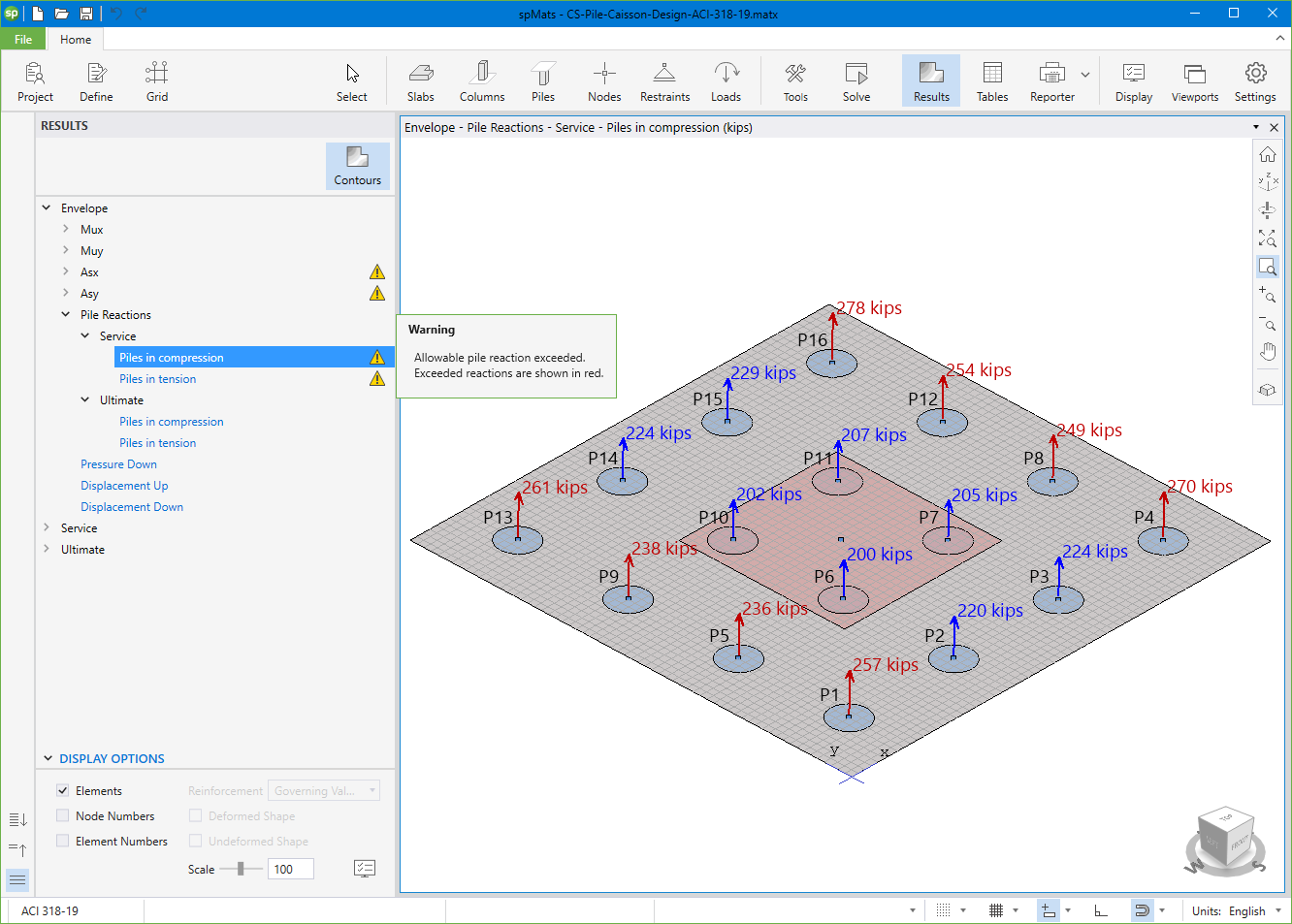 This graphical view displays the envelope results for reactions of Piles in Compression and Piles in Tension under Service and Ultimate load combinations. Pile reactions are represented graphically with directional arrows - upward arrows for compression and downward arrows for tension. When allowable pile reactions are defined by the user, the program will automatically evaluate each pile's reaction against these limits. Pile reactions that do not exceed the allowable values are displayed in blue, while those that exceed are highlighted in red to alert the user. A warning icon will also appear in the Contours tree to indicate that one or more pile reactions exceed the allowable limit. Note that allowable pile reactions, when specified, are only applicable to and compared with the Service pile reactions.