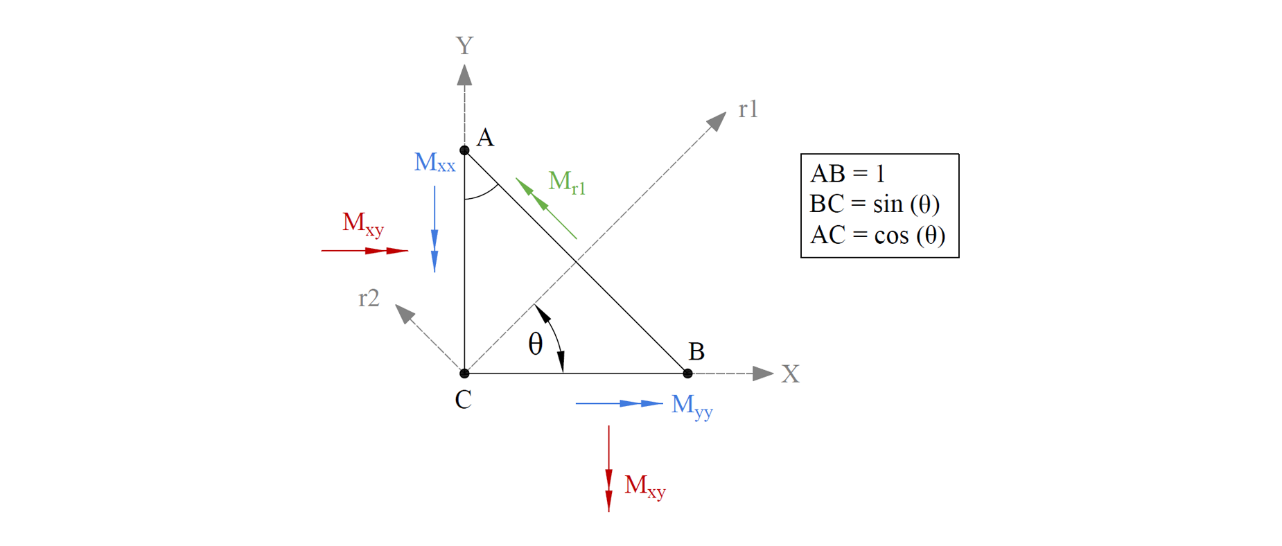 The principal moments, Mr1 and Mr2, and the principal angle, are computed from the general moment transformation equations. Since Mr1 and Mr2 are principal moments, the twisting moment associated with the r1-r2 axes (Mr12) is zero.