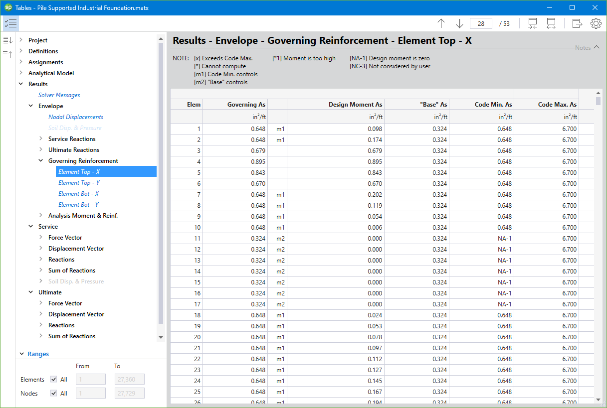 The Tabular output can be found both in the Tables Module and the Reporter Module. The Tables Module may be utilized to view and export the model output at any model development stage. The Reporter Module may be utilized to create, export and print customized reports when the design is finalized. Both modules have the same output sections. The differences being that of the Reporter Module contains the cover & contents, and screenshots sections. The Tables Module contains the Solver Messages section. The tables may be fully or partially output for all or for only selected nodes, and elements.