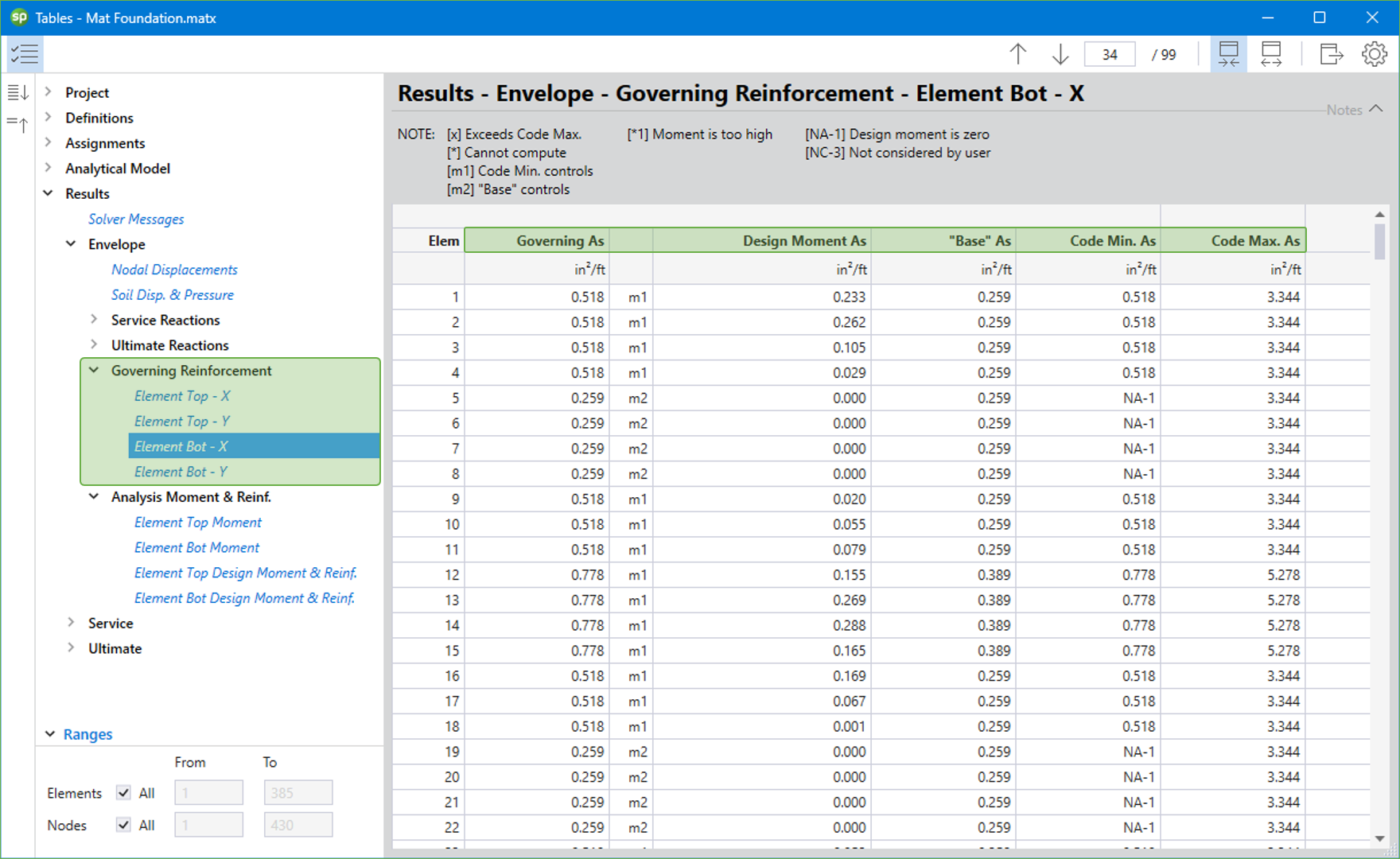 The Program reports the area of flexural reinforcement per unit width [in.2/ft (US Customary Units) or mm2/m (Metric Units)]. The total area of reinforcement in an element, then, can be obtained by multiplying the reported area of reinforcement by the width of the element.