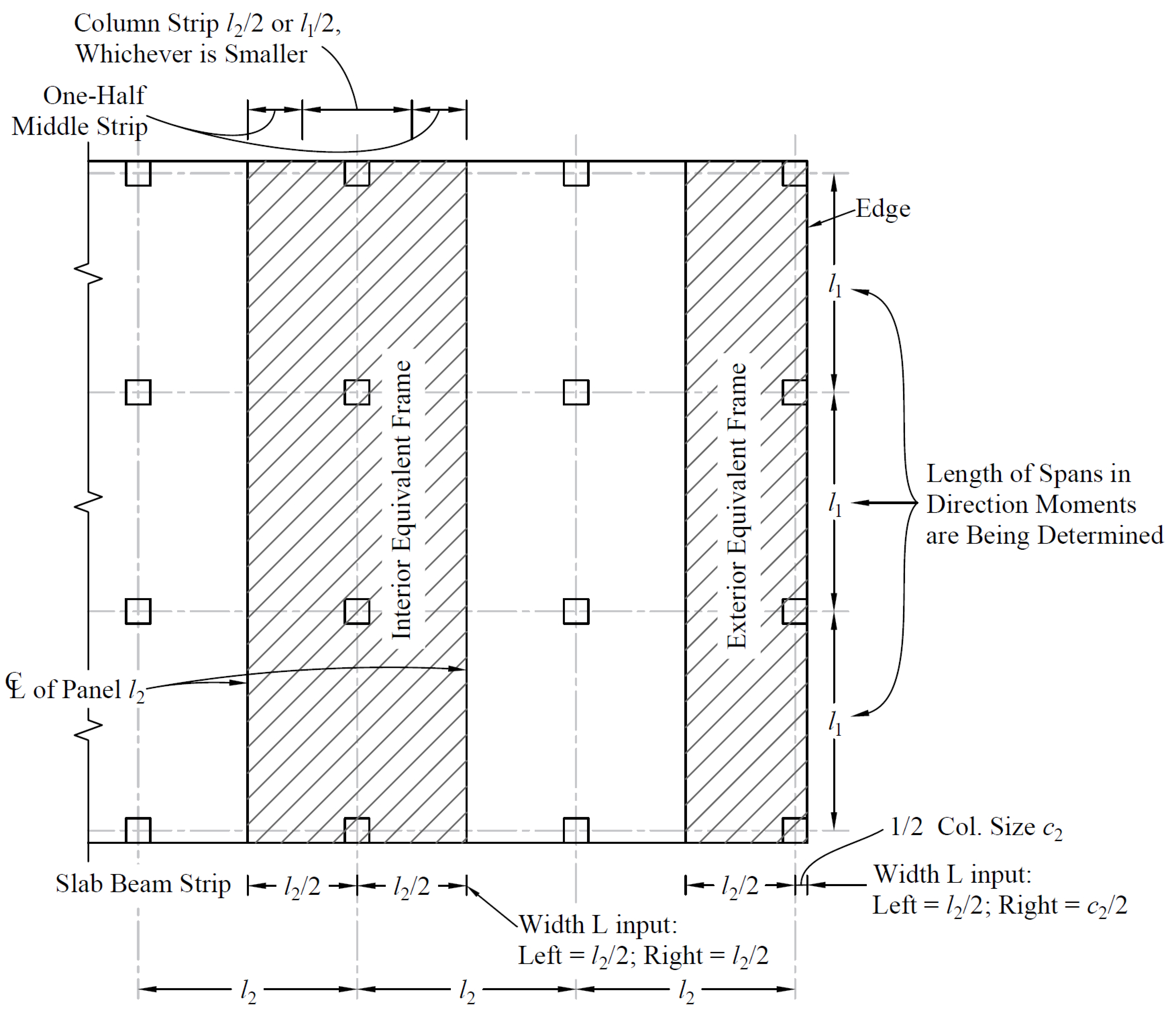 Note: For exterior frames, the edge width should be specified to the edge of the slab from the column centerline. Entering edge width greater than l1 / 4 involves engineering judgment regarding two-way behavior of the system and the applicability of the equivalent frame method.