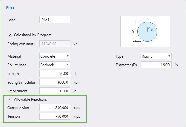 Users can now define allowable service reactions for piles, enabling visual feedback in the graphical output.