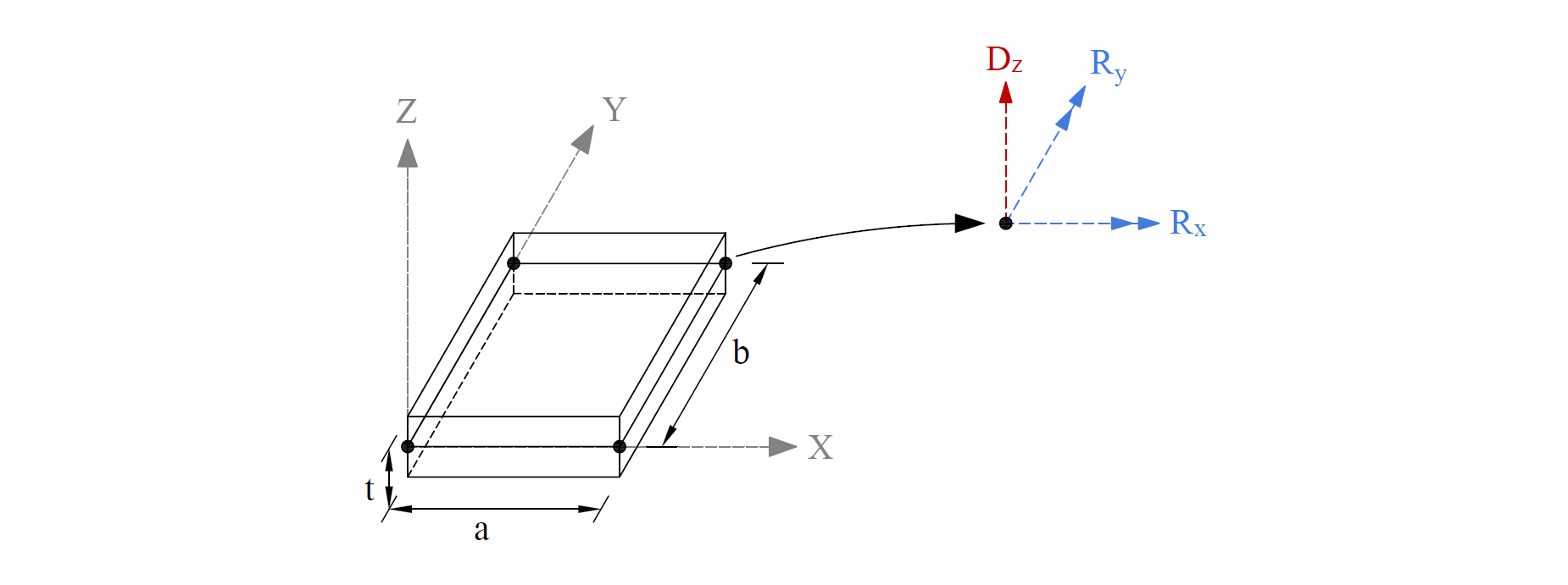 The rectangular plate finite element used in spMats has four nodes at the corners and three degrees of freedom (Dz, Rx and Ry) per node. This element considers the thin plate theory, which makes use of the Kirchhoff hypotheses.