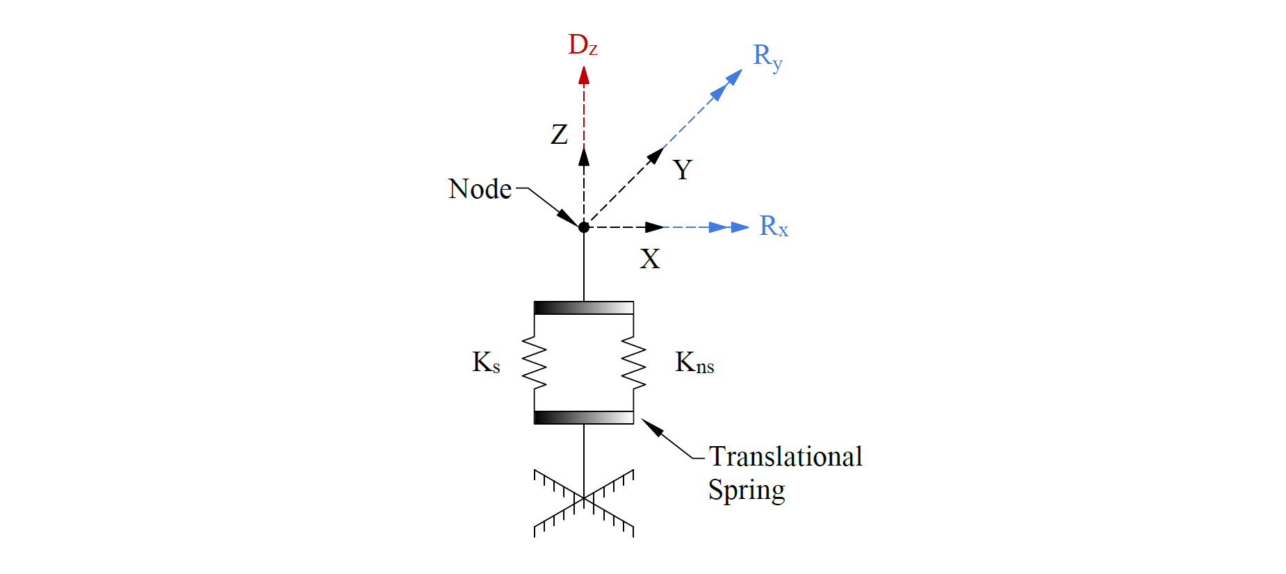 The soil supporting the slab is modeled as a group of linear uncoupled springs (Winkler type) concentrated at the nodes. The soil element is tensionless, weightless, and has one degree of freedom, which is the displacement in the Z direction (Dz).