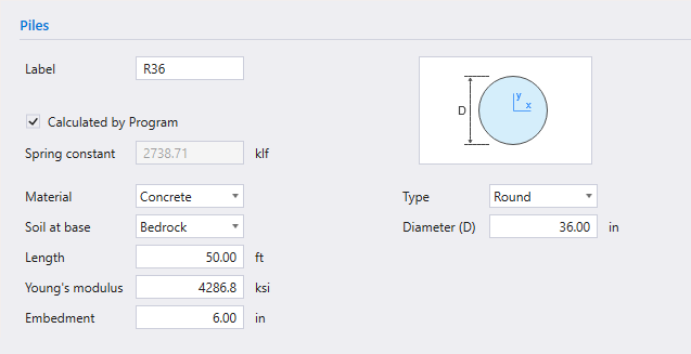 Piles are modeled as springs connected to the nodes of the finite element model. The spring constant, Kp, for a pile is calculated from the formula: Kp = Qu/S where Qu denotes the load applied to the pile and S is the corresponding settlement of the pile.