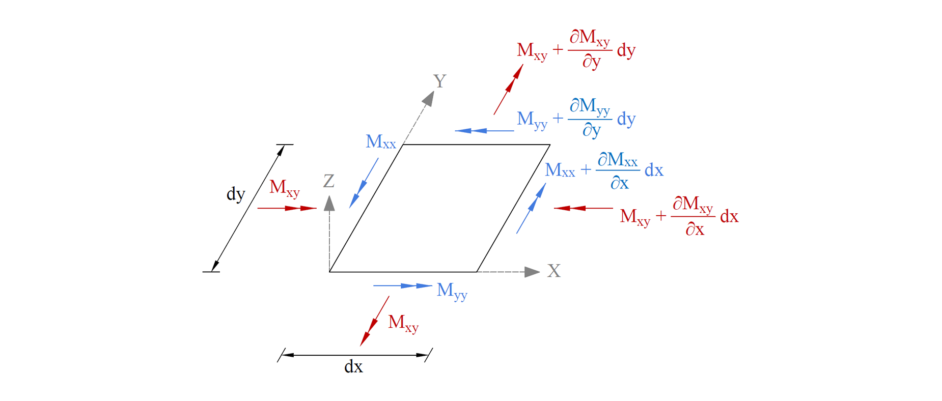 The Principal of Minimum Resistance is used by spMats to obtain values for the design moments, which include the effects of the twisting moment. Then, the equivalent design bending moments, Mux and Muy, for the design of reinforcing steel respectively in the X and Y direction are computed.
