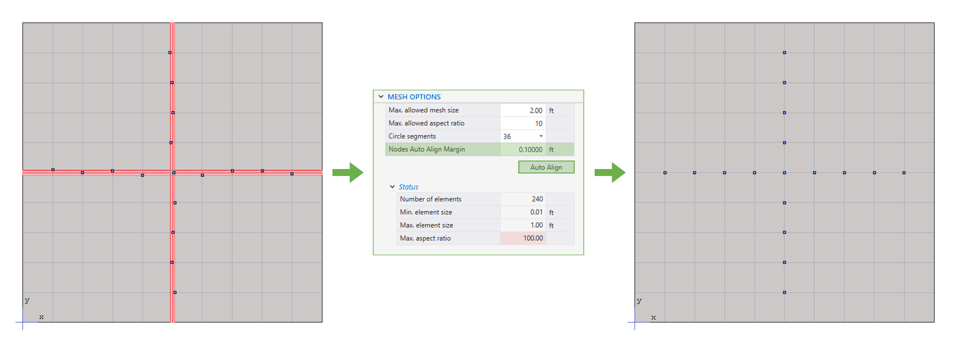 By setting a tolerance margin, and running "Auto Align", the program snaps nearby nodes to a common axis, producing a cleaner mesh and more reliable analysis.