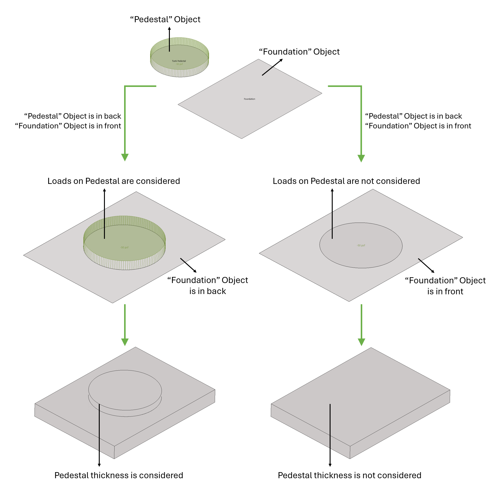 spMats, the inclusion of pedestal loads and thickness in the analysis depends on the order the objects are drawn in the model. If the pedestal object is set forward and the foundation object is backward, loads applied to the pedestal are properly considered, and its thickness is included in the model analysis. However, if the pedestal is drawn behind the foundation, the loads and thickness will be ignored in the analysis.